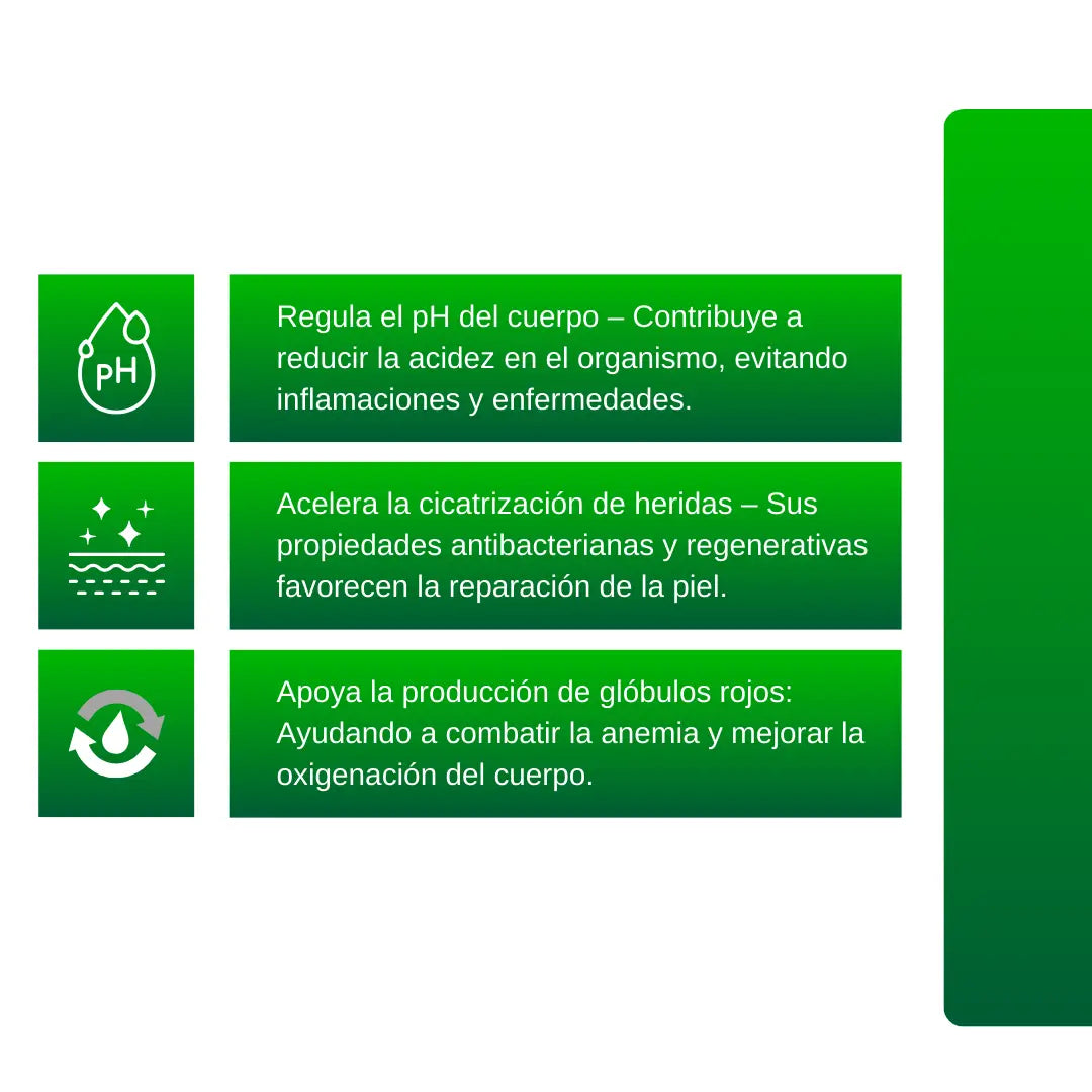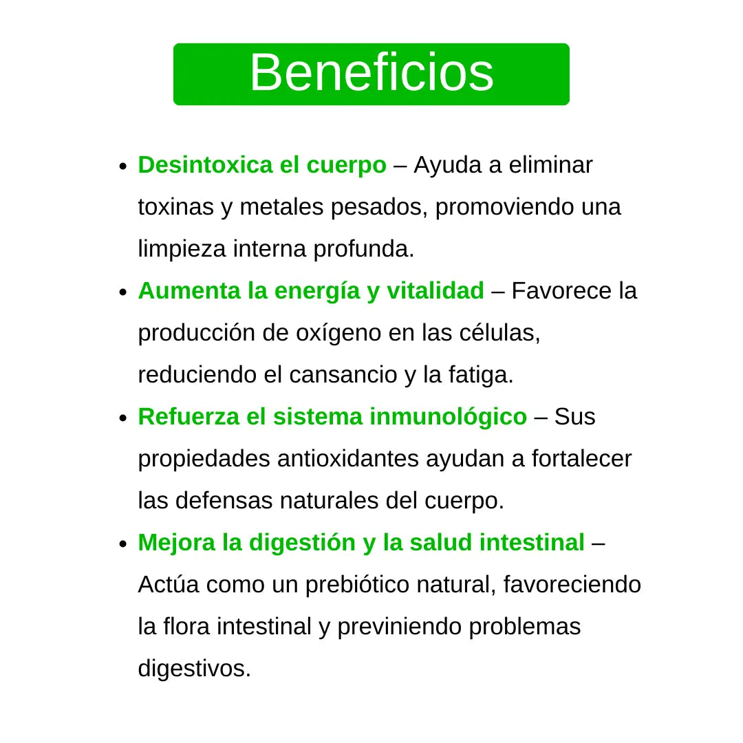 Beneficios principales: Alta concentración de nutrientes esenciales. Potente antioxidante y desintoxicante. Mejora la digestión y la salud intestinal. Aumenta la energía y la vitalidad. Refuerza el sistema inmunológico