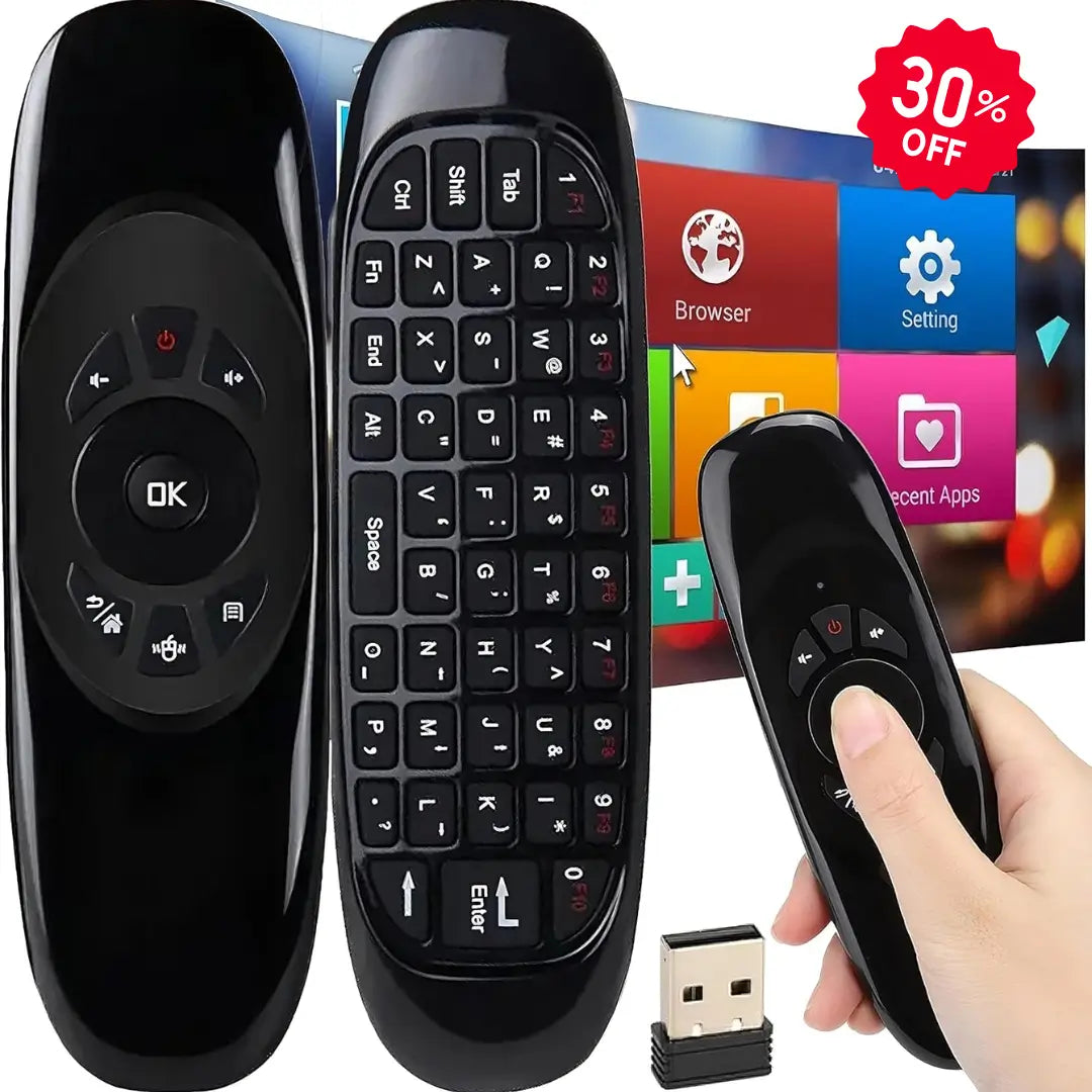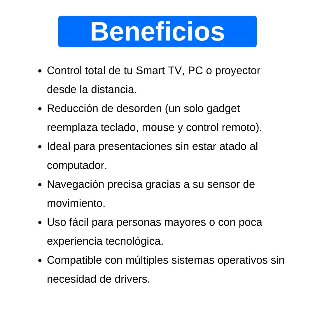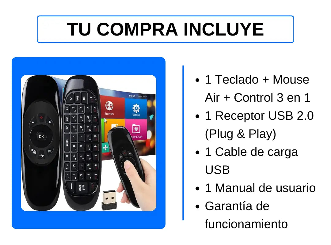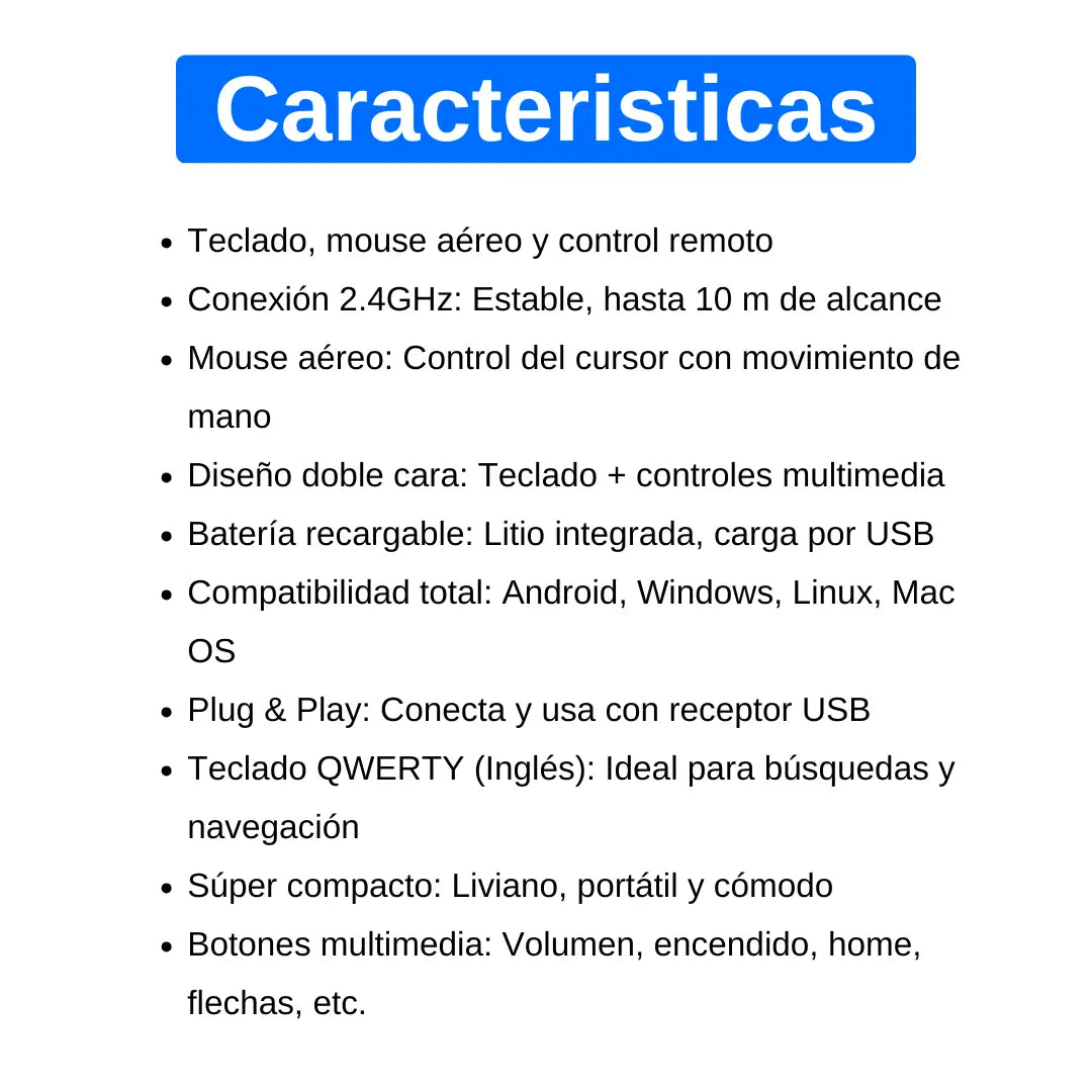 Controla tu TV, computador o dispositivo Android desde cualquier rincón de la casa con este poderoso control 3 en 1. Teclado, mouse aéreo y mando multimedia… ¡Todo en uno y sin complicaciones!