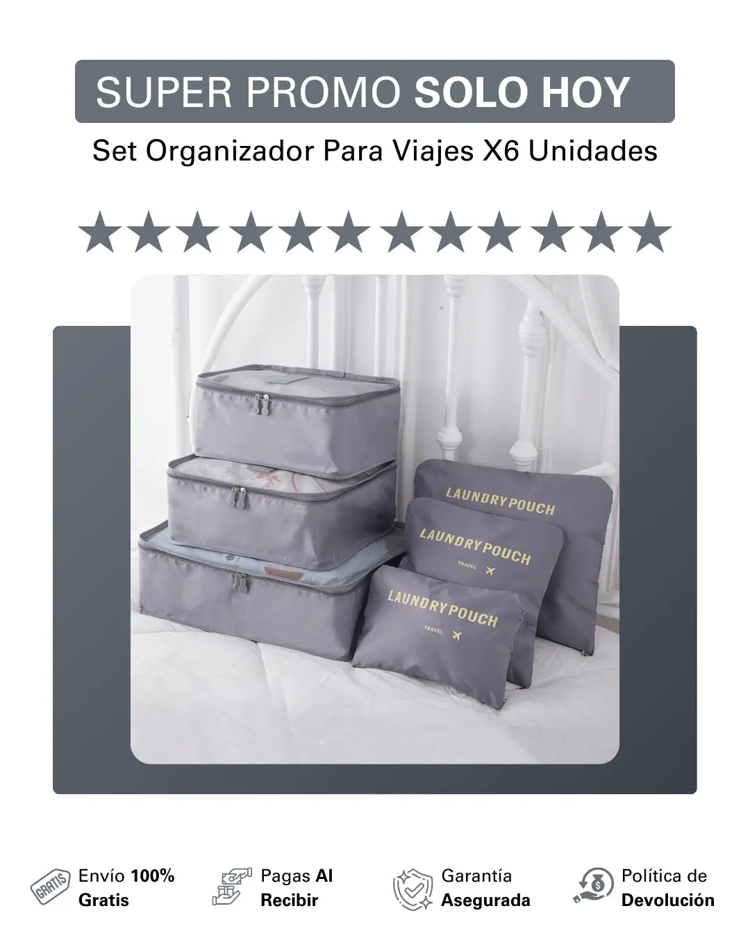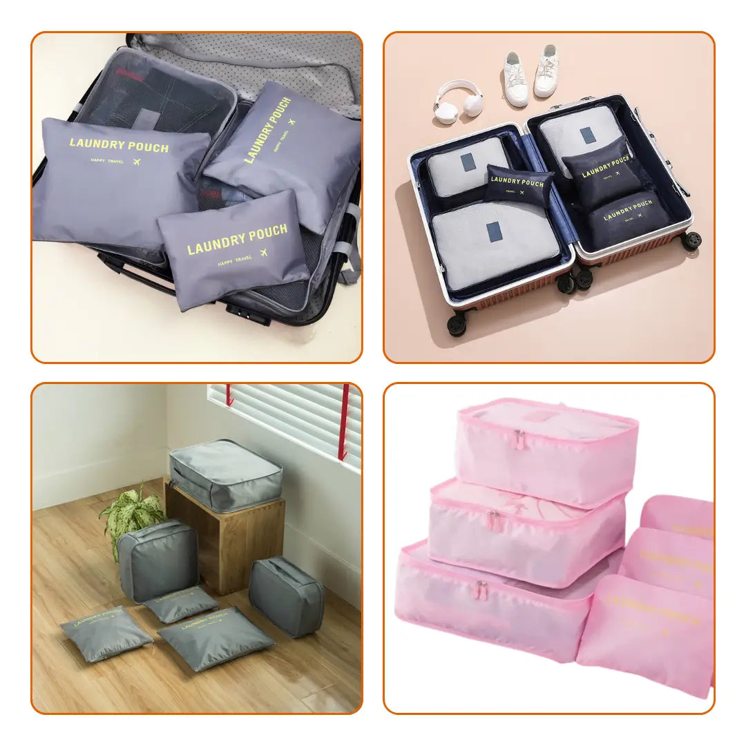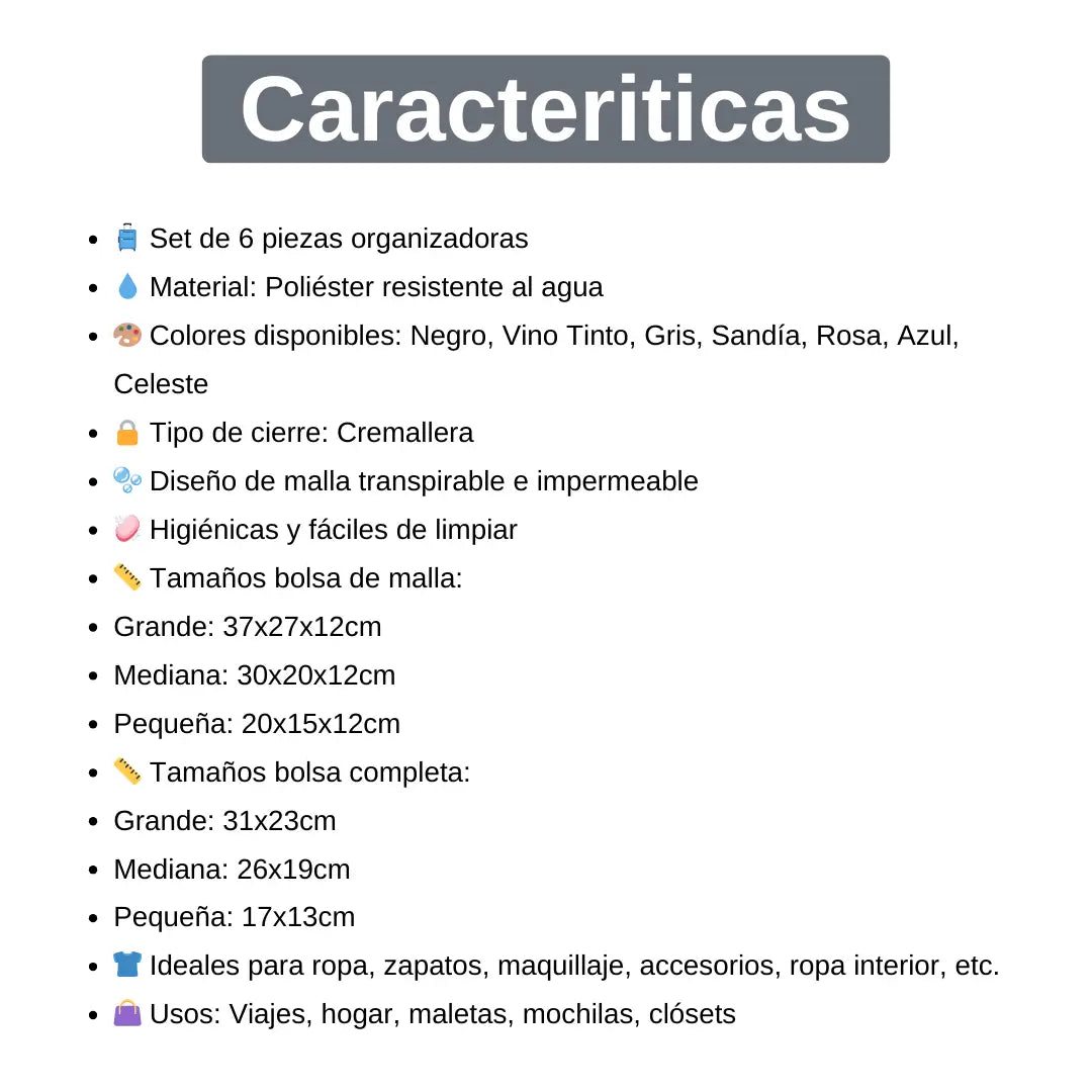 Organiza tu ropa, zapatos, maquillaje o accesorios con estilo y eficiencia. Este set de 6 bolsas es perfecto para cada viaje o para mantener el orden en casa.